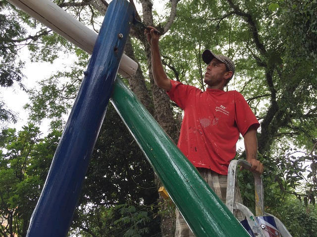 No final da semana passada, o empresário Neri Felten da NF Pinturas terminou a revitalização dos brinquedos do Playground da Praça da Matriz. A iniciativa partiu dele próprio que procurou o Gabinete da Primeira-Dama Cristiane Wickert para oferecer os serviços. A “Pracinha” ganhou mais cor que fez a alegria da criançada.