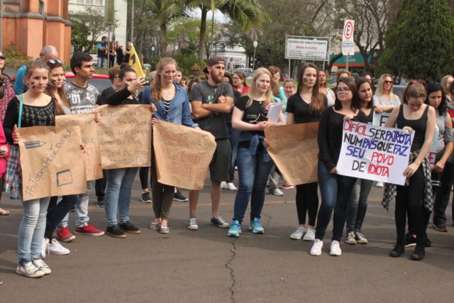 Alunos de escolas estaduais e professores realizam na tarde desta segunda-feira, mobilização contra o parcelamento dos salários. Em greve, a categoria protesta contra o governo do Estado. No total, representantes de nove escolas estaduais, integraram o ato público, organizado por estudantes, e com apoio do Cpers, 18º núcleo.