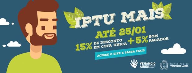 1 Quem pagar o IPTU à vista até 25 de janeiro pode obter um total de 20% de desconto: 15% pela quitação em cota única e 5% de bom pagador, para aqueles que não têm débitos de IPTU e taxa de lixo com a Prefeitura.