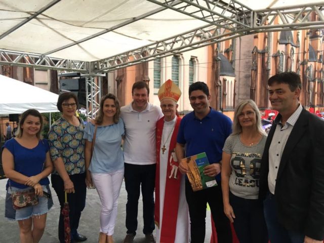 O Secretário de Obras Saneamento e Habitação do Estado Fabiano Pereira (PSB) participou dos festejos no último domingo, 21, da 142ª Festa de São Sebastião Mártir. Na oportunidade, a Secretária de Planejamento Orçamento e Gestão do Município Jalila Heinemann, o Prefeito Giovane Wickert e o Vice-Prefeito Celso Krämer entregaram para o gestor estadual uma cópia do projeto do parque da Estação de Tratamento de Esgoto (ETE).