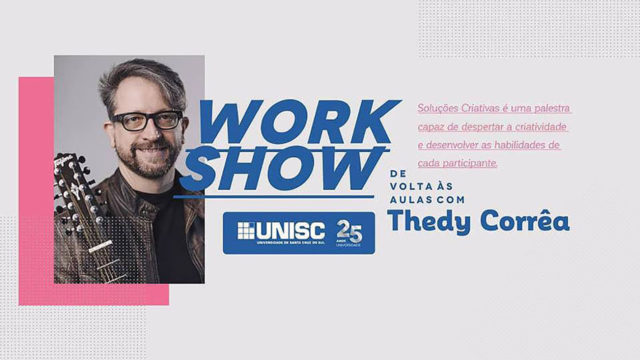 A Universidade de Santa Cruz do Sul (Unisc) promove Workshow de volta às aulas com o músico e compositor da banda Nenhum de Nós, Thedy Corrêa. A atividade alusiva aos 25 anos da Instituição ocorre nesta quinta-feira, 22 de março, às 19h15, no Auditório Central. O Workshow Soluções Criativas é uma palestra que busca despertar a criatividade e desenvolver as habilidades de cada participante.