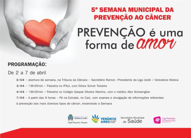 As programações para a 5ª edição da Semana Municipal da Prevenção ao Câncer iniciam nesta segunda-feira,02, na Câmara dos Vereadores. Durante os dias 02 e 07 de abril haverá ações voltadas a promoção da saúde e prevenção ao câncer.