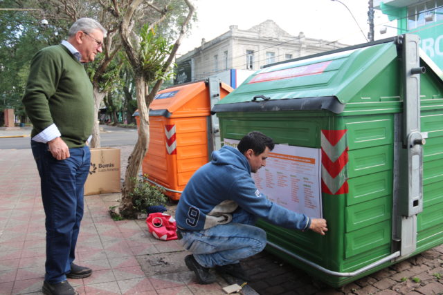 Iniciou na tarde da terça-feira, 10, a colocação de adesivo com o calendário de recolhimento de resíduos secos e orgânicos nos contêineres localizados no centro do município. Quem acompanhou o início dos trabalhos foi o Secretário do Meio Ambiente Clóvis Schwertner que avaliou positivamente a colocação da informação. “Agora todos os contêineres receberão o adesivo que informa os dias que cada tipo de resíduo será recolhido, auxiliando no descarte correto por parte dos munícipes”. O investimento será de R$11 mil e a empresa contratada tem 90 dias para concluir o trabalho em todos os 296 contêineres.