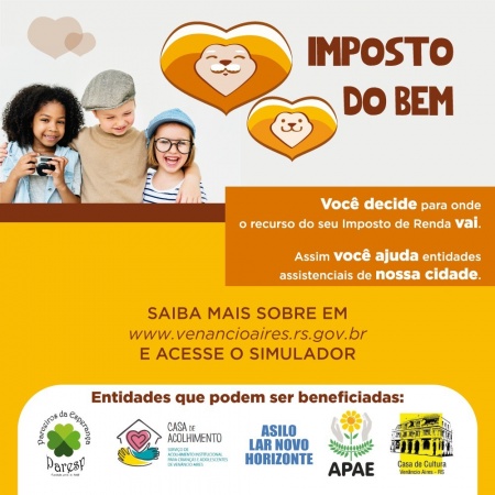 A comunidade de Venâncio Aires pode até sexta-feira, 28, destinar 6% do Imposto de Renda (IR) para entidades assistenciais do Município que estão vinculadas ao Fundo Municipal do Idoso, ao Fundo de Cultura ou ainda ao Conselho Municipal dos Direitos da Criança e do Adolescente (COMDICA).