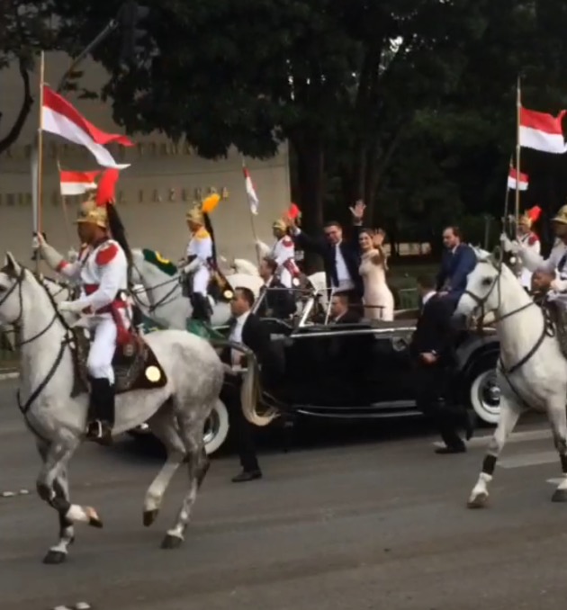 Dos gramados do parlamento, Jair Bolsonaro seguiu para o Palácio do Planalto em carro aberto ao lado da primeira-dama para receber a faixa presidencial de Temer. O agora ex-presidente da República aguardava o sucessor na companhia da mulher, Marcela Temer, na porta da entrada principal do salão nobre do Planalto.