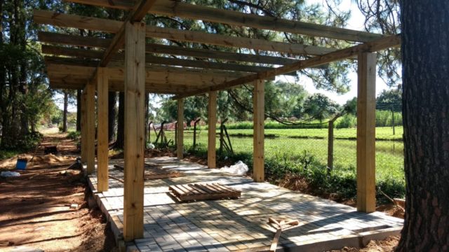 A abertura do traçado ao longo da via já foi realizada, além da construção das áreas de descanso com pergolados. A partir de agora será realizada a conclusão do passeio público, com a colocação de material para alinhamento do trajeto.