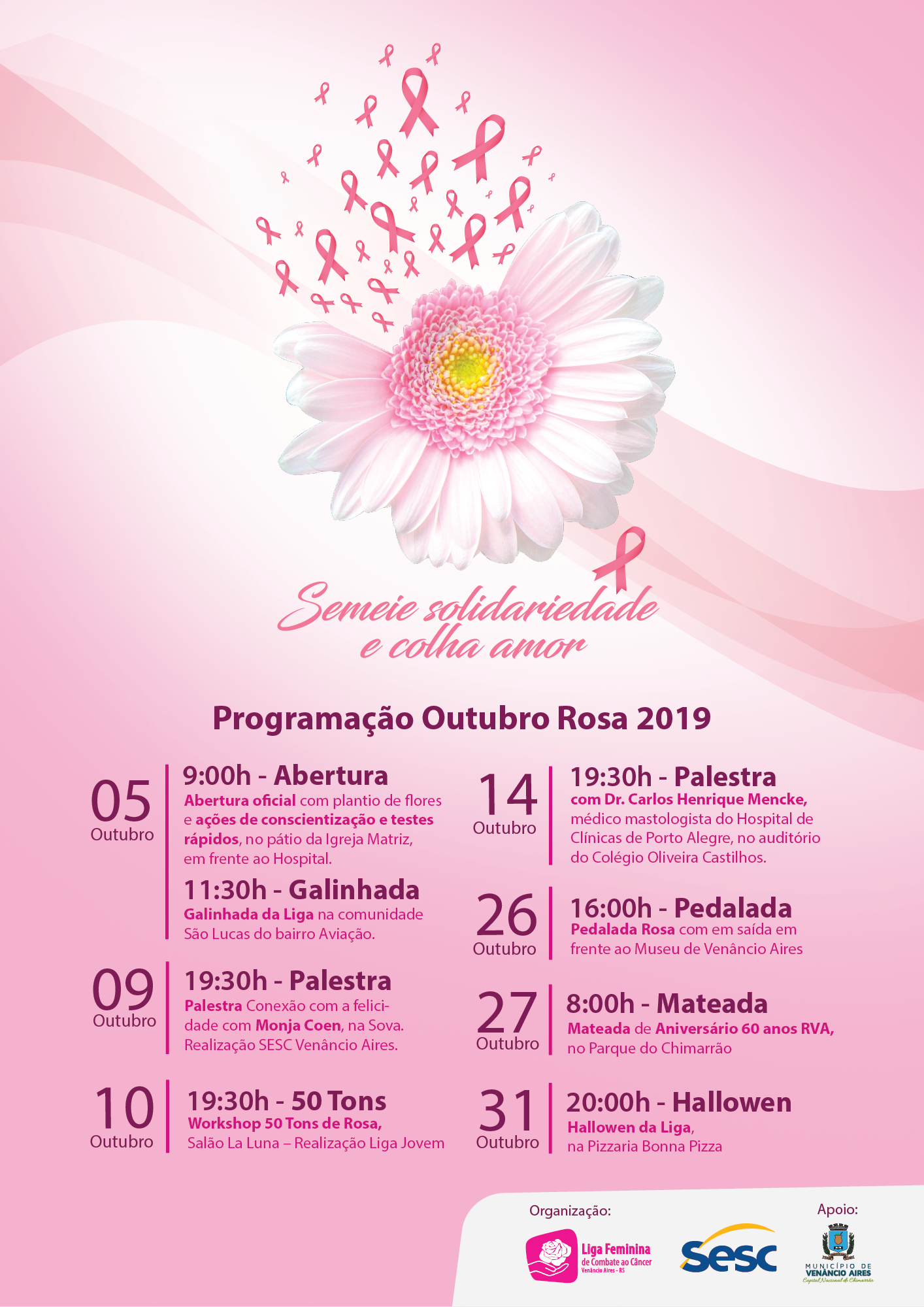 A Liga Feminina de Combate ao Câncer de Venâncio Aires prepara uma extensa programação alusiva ao Outubro Rosa, mês dedicado à prevenção do câncer de mama. Ao longo de todo o mês, eventos de integração e palestras acontecem sob o tema: “Semeie Solidariedade e Colha Amor”. A programação será aberta neste sábado, 05, com atividades junto ao pátio da Igreja Matriz.