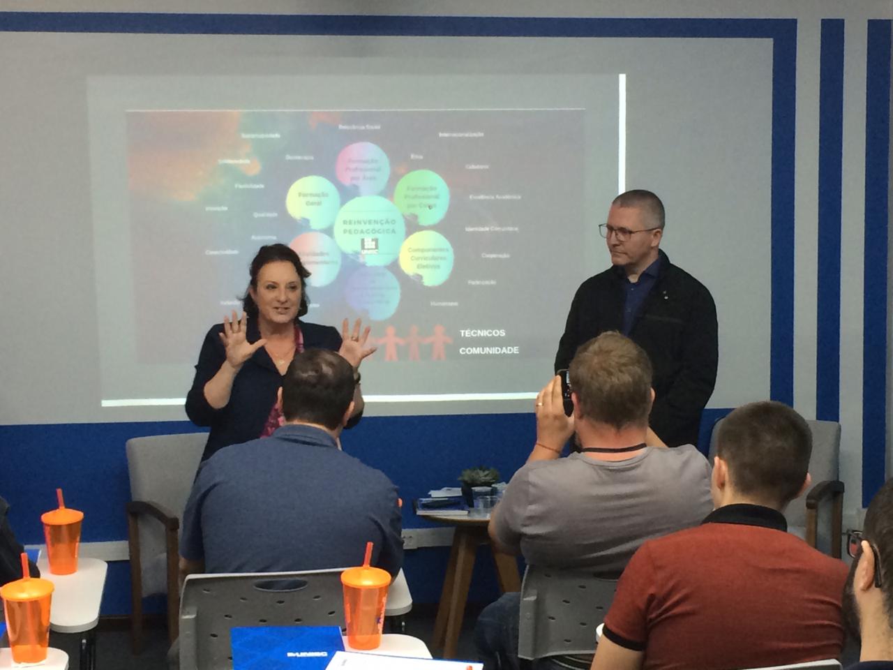 A Universidade de Santa Cruz do Sul (Unisc) apresentou na manhã desta quinta-feira, 24 de outubro, no Auditório do EaD, no bloco 16, o seu Projeto de reinvenção pedagógica, que prevê novas arquiteturas curriculares, novos conteúdos, novas competências e preço mais acessível. Durante entrevista coletiva, a reitora, Carmen Lúcia de Lima Helfer, e o vice-reitor, Rafael Frederico Henn, afirmaram que a reinvenção pedagógica da Instituição traz flexibilidade na trajetória acadêmica. “O DNA empreendedor incentiva a autonomia do estudante com conexão ao mercado de trabalho para potencializar sua formação superior e traduz conteúdos em práticas e módulos interdisciplinares em experiências de aprendizagem completas, conectando universidade, comunidade e empresas”, disseram. Dessa forma, os estudantes terão vivências de aprendizagem em cenários reais e simulados desde o primeiro mês de aula na Unisc e concluirão os cursos com as competências que o futuro necessita.