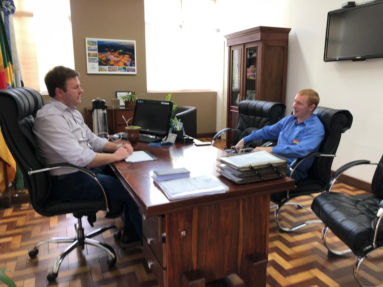 Nesta manhã, 10, o Diretor Fábio Kroth visitou o Prefeito Giovane Wickert para retribuir a visita que o Gestor, juntamente com os Secretários de Desenvolvimento Rural, André Kaufman e de Segurança Pública, Dário Martins, fizeram à empresa no final do ano passado. Na ocasião, Wickert conheceu os projetos de extensão e ampliação da empresa, o processo de produção e todo o sistema rigoroso de cuidados e vigilância interna.