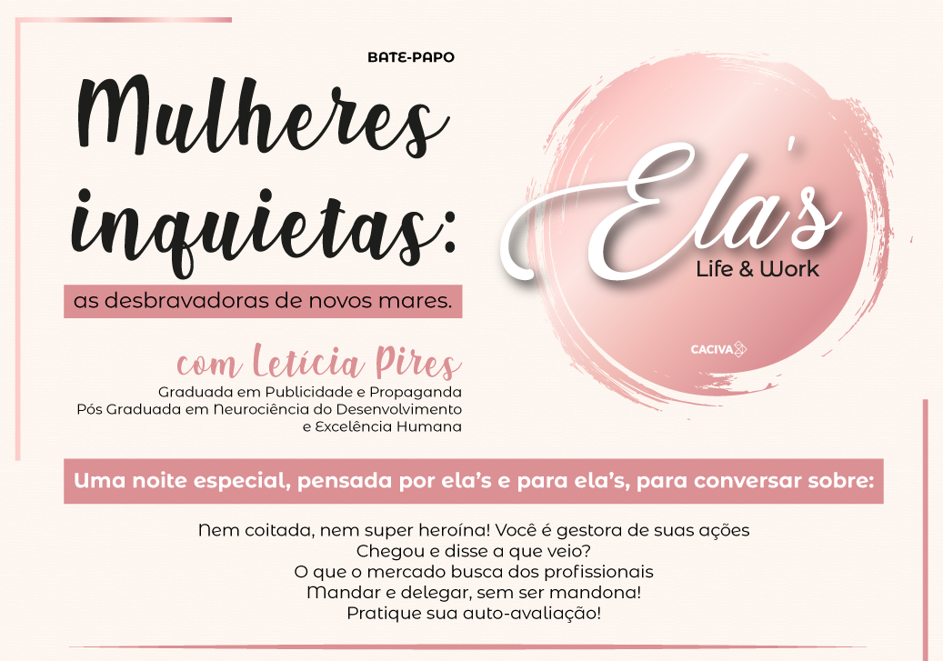 O bate-papo “Mulheres inquietas: as desbravadoras de novos mares”, com Letícia Paese Pires, agendado para o dia 10 de março, na Cervejaria Max Haus, já está com seus ingressos esgotados. O evento faz parte do Projeto Ela’s, idealizado pelas empresárias que compõe a diretoria da Caciva. Mais dois eventos serão realizados pelo grupo, voltados exclusivamente para o público feminino, para inspirar e unir as empresárias de nosso município e região, contribuindo para o desenvolvimento pessoal e de seus negócios.