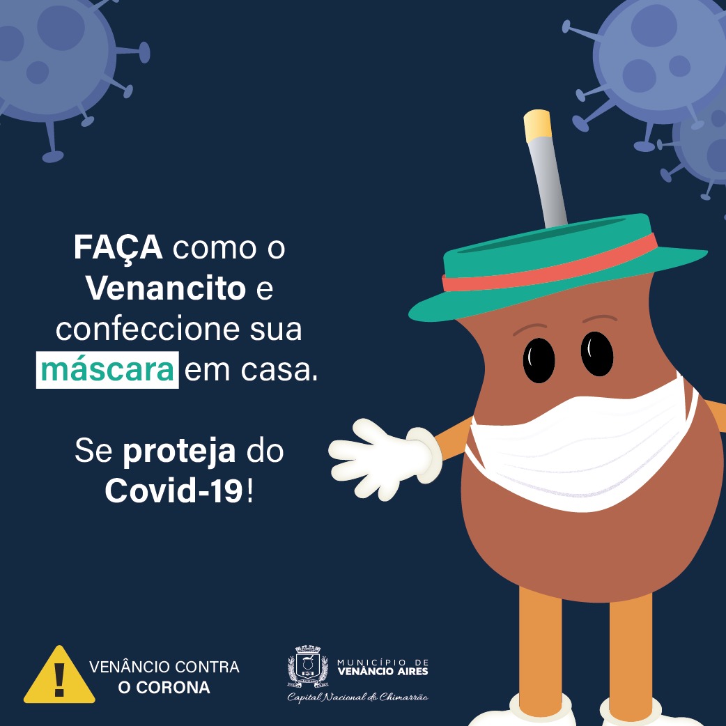Confeccionar uma máscara caseira é fácil e existem dois modelos indicados pela Secretaria de Saúde. O mascote do Município, Venancito, entrou na campanha digital e convida os Munícipes a customizarem suas máscaras. Para isso, ele lembra que as pessoas devem usar quando realmente necessitar sair de casa, lembrando que a melhor proteção ao coronavírus é o isolamento social.