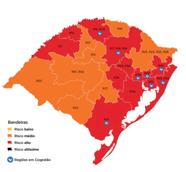 O governador Eduardo Leite divulgou, nesta segunda-feira, que 12 das 21 regiões ficarão com a bandeira vermelha na 16ª rodada do Distanciamento Controlado. As áreas de Lajeado e Santa Cruz do Sul apresentaram aumento de contaminação nesta semana e foram classificadas como alto risco para coronavírus. Já Porto Alegre, Canoas, Novo Hamburgo, Taquara, Capão da Canoa, Santo ngelo, Santa Rosa, Palmeiras das Missões, Passo Fundo e Pelotas permanecem em bandeira vermelha nesta rodada.