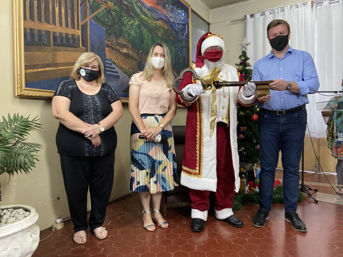 A abertura da quarta edição do Natal Cor e Magia de Venâncio – encabeçado pelo Gabinete da Primeira-Dama, com apoio do Sesc e Guia Venâncio -,foi realizada na sexta-feira, 11, com uma live que contou com a chegada do Papai Noel, que recebeu a chave da cidade das mãos do Prefeito Giovane Wickert, que participou do ato ao lado da Primeira-Dama, Cristiane Wickert e da Secretária Municipal de Cultura, Alice Theis.