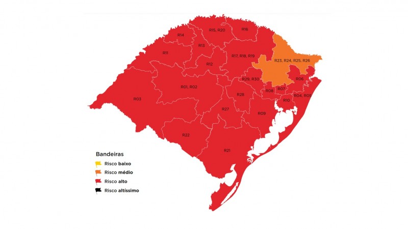 Das 21 regiões Covid, apenas uma, Caxias do Sul recebeu bandeira laranja. As demais receberam bandeira vermelha, com alto risco epidemiológico.