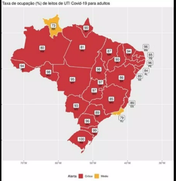 Entre as 27 unidades da federação, 24 estados e o DF estão com ocupação de leitos de UTI acima dos 80%. Entre esses estados, 15 tem ocupação maior que 90%. Roraima (73%) e Rio de Janeiro (79%) são as únicas duas unidades da federação com índices mais baixos.