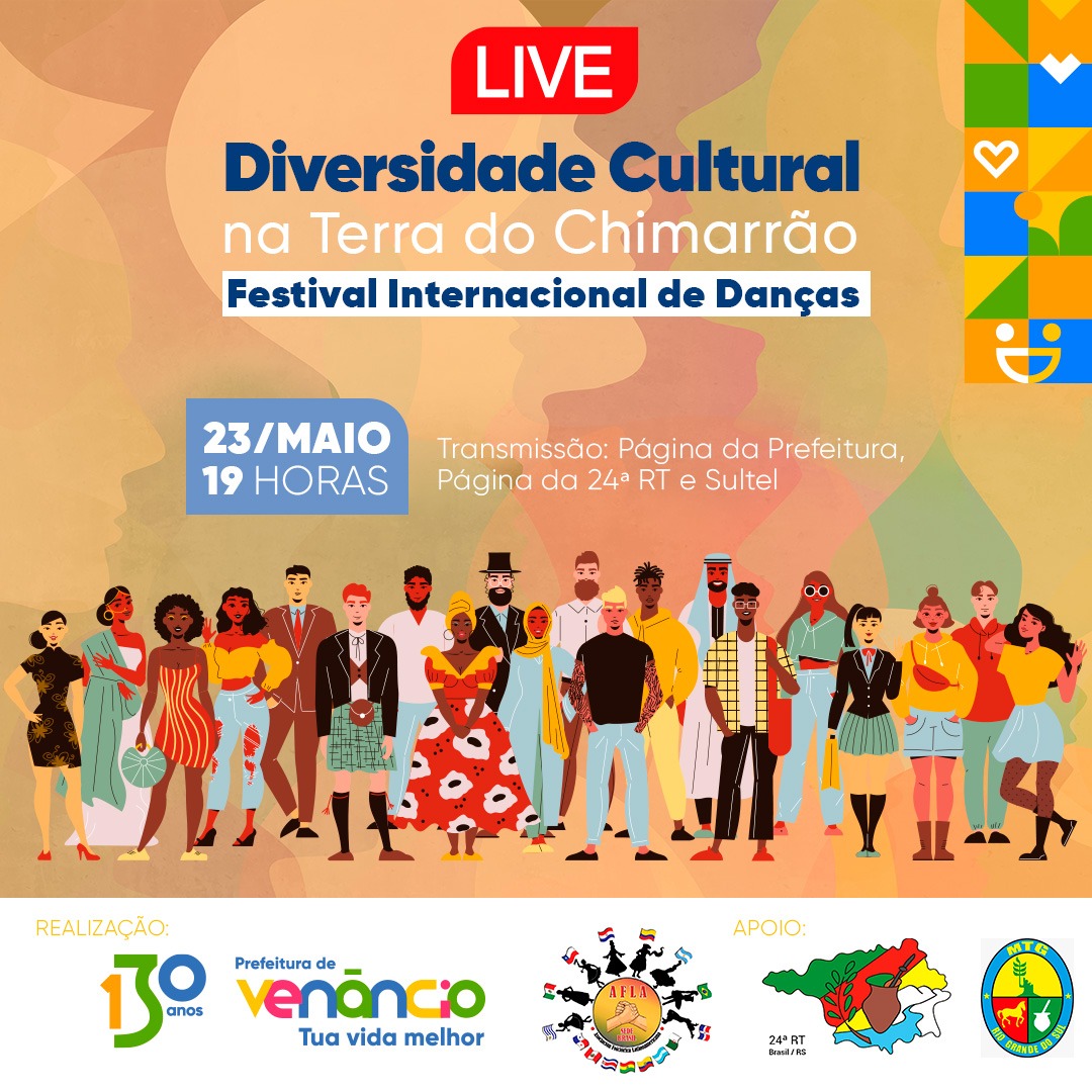 Venâncio Aires vai representar a cultura brasileira na Live Diversidade Cultural na Terra do Chimarrão que acontece no domingo, 23, dentro das programações de 130 anos do município, a partir das 19 horas. Transmitida pelas fanpages da Prefeitura e Sultel, a programação terá apresentações de vídeos de entidades culturais de países das Américas do Norte, Central (incluindo Caribe) e do Sul, Ásia, África e Europa, totalizando 28 países, celebrando a diversidade cultural pelo mundo. Da Capital do Chimarrão participam os grupos Die Schwalben, CTG Erva Mate, DTG Piazito da Tradição, CTG Chaleira Preta, GF Essência da Tradição e a Liga de Samba de Venâncio Aires.