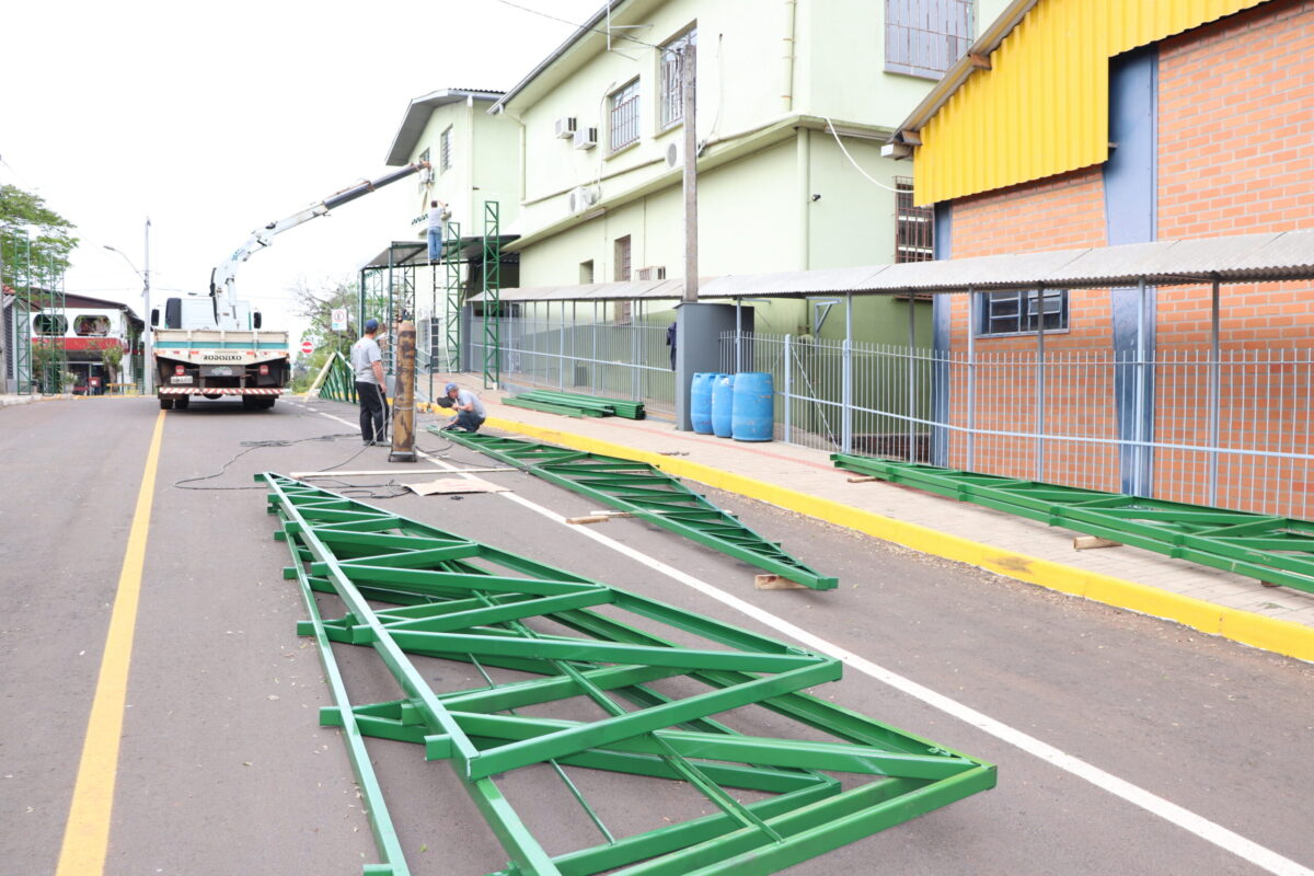 Equipe da empresa Invicta Construtora está trabalhando na montagem da ‘rua coberta’ em trecho da Rua Otto Bugs, lateral do Colégio Estadual Poncho Verde. O serviço envolve a estrutura metálica com 262,50 metros.