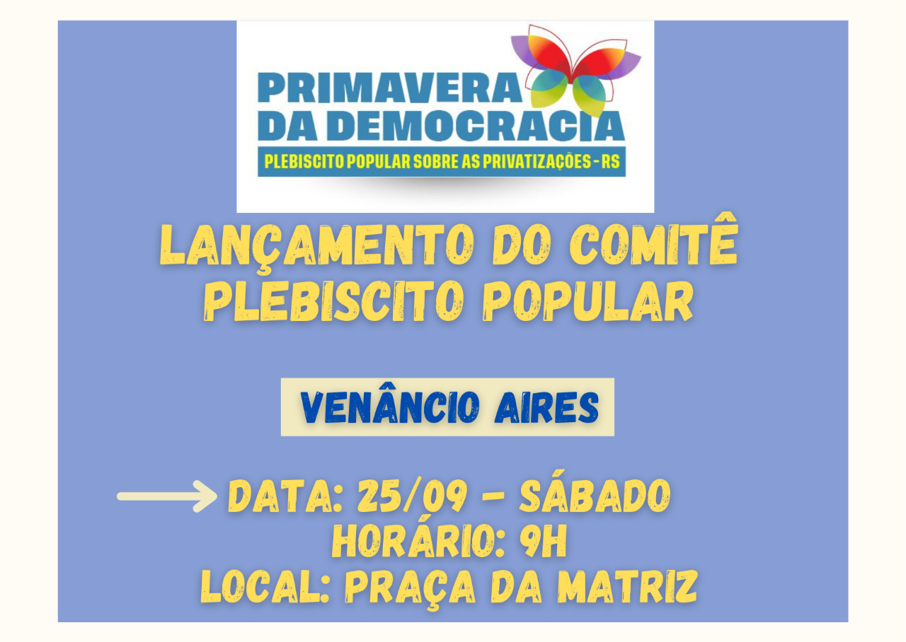 Venâncio Aires inicia neste sábado, 25, debate sobre as privatizações de empresas pública no Rio Grande do Sul. O momento será marcado com lançamento do Comitê Plebiscito Popular, formado por sindicatos e sociedade civil. A programação será às 9h, na praça da Matriz e faz parte do movimento Primavera da Democracia, preparatório ao plebiscito popular marcado para o mês de outubro.