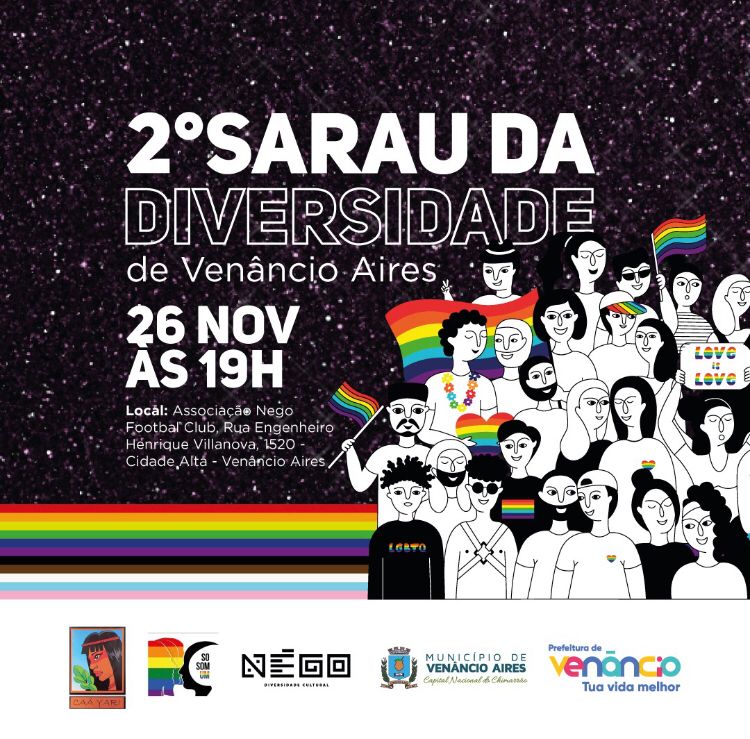 No próximo dia 26 de novembro Venâncio Aires terá a 2ª edição do Sarau da Diversidade. O evento inicia às 19h na Associação Nego Football Club, na rua Engenheiro Henrique Villanova, número 1.520, no bairro Cidade Alta. A programação é organizada pela Prefeitura de Venâncio Aires, por meio da Biblioteca Pública Caá Yari, Négo e o Grupo Somos Um.