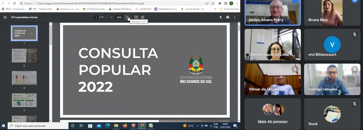 Integrantes do Conselho Regional de Desenvolvimento do Vale do Rio Pardo (Corede/VRP) realizaram uma Assembleia Inicial Regional de forma remota, por videoconferência, na manhã desta sexta-feira, dia 22, quando foram definidas algumas ações iniciais da região em relação ao processo da Consulta Popular 2022/2023.