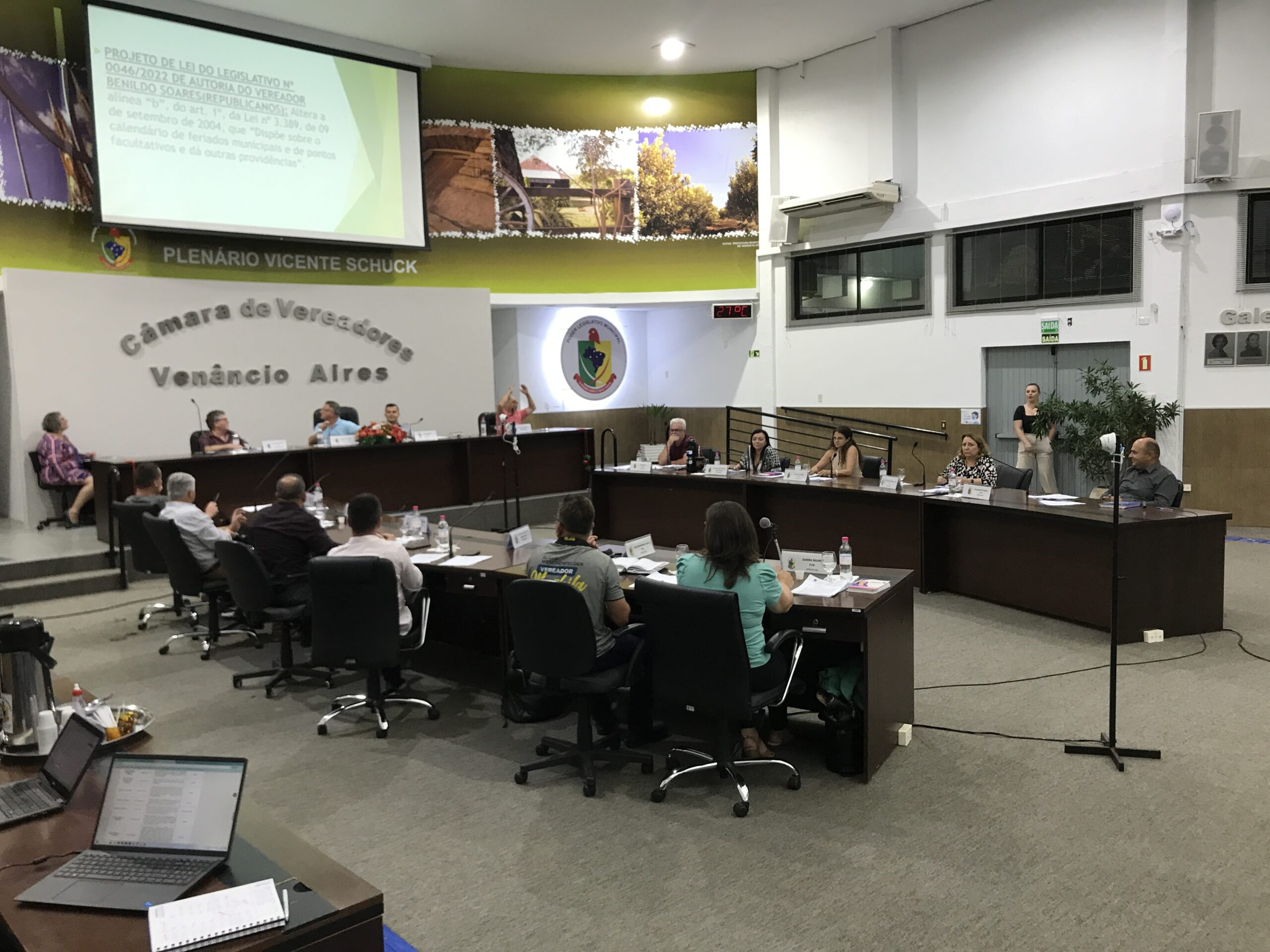 Na sessão da Câmara de Vereadores desta segunda-feira, 19, estava prevista a votação da legislação de autoria do vereador Benildo Soares (Republicanos), propondo o retorno do feriado municipal para o dia 11 de maio, aniversário de emancipação de Venâncio Aires. A legislação estava em tramitação no Parlamento Municipal desde novembro, após análise jurídica, consultas públicas e enquetes. Com vereadores se posicionando contra a lei, o presidente da Casa, autor da lei, retirou a proposta de votação.