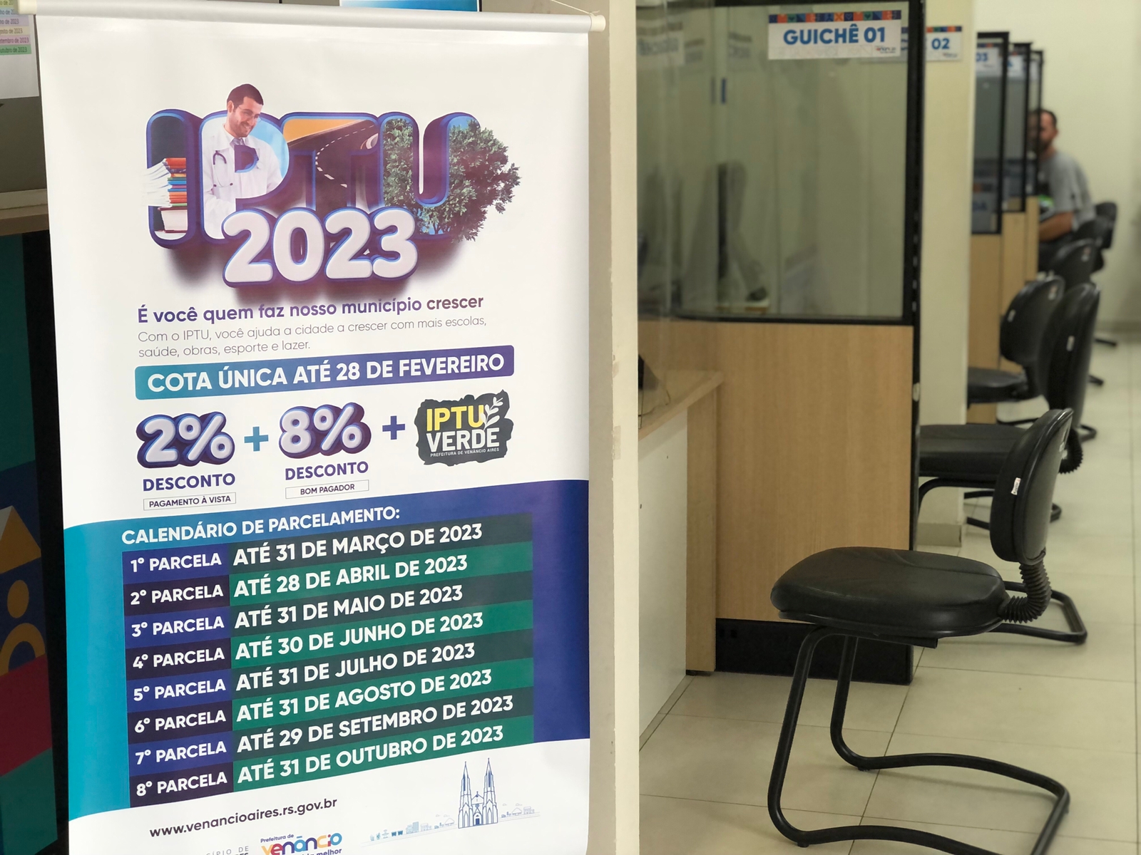 As guias do Imposto Predial e Territorial Urbano (IPTU) de Venâncio Aires para pagamentos em cota única estarão disponíveis a partir de segunda-feira, 16. Os boletos serão liberados de forma on-line através do site da Prefeitura e presencialmente no balcão de atendimento da administração municipal.