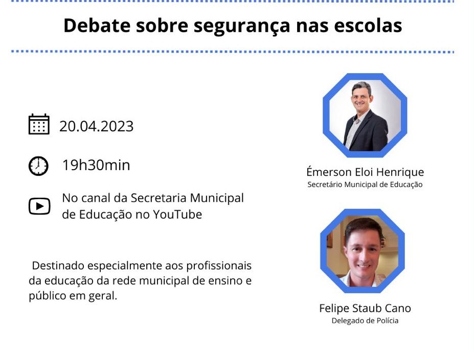 O debate é destinado especialmente aos profissionais de educação da rede municipal de ensino e público em geral. Participam da transmissão o delegado de Polícia, Felipe Staub Cano, e o secretário municipal de Educação, Émerson Eloi Henrique.