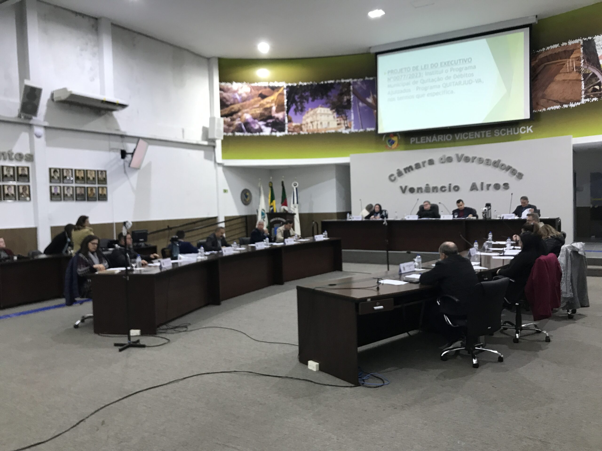 A Câmara de Vereadores contou com 13 projetos na pauta de votações na sessão desta segunda-feira, 17. Destes, nove matérias envolvem projetos de lei. Destaque para a legislação que cria o Programa Municipal de Quitação de Débitos Ajuizados. O Quitarajud-VA, busca oportunizar aos contribuintes com dívidas junto a Prefeitura de Venâncio Aires, negociar os valores, com redução de juros e multas. A adesão ao programa será efetivada com a liquidação da dívida consolidada em cota única, até o dia 20 de dezembro de 2023. Atualmente a dívida ativa judicializada chega a R$ 50 milhões. Deste valor, a estimativa possível de cobrança alcança R$ 20 milhões. A meta do Governo Municipal é de arrecadar cerca de R$ 1 milhão com o programa autorizado pelo Legislativo nesta segunda-feira.