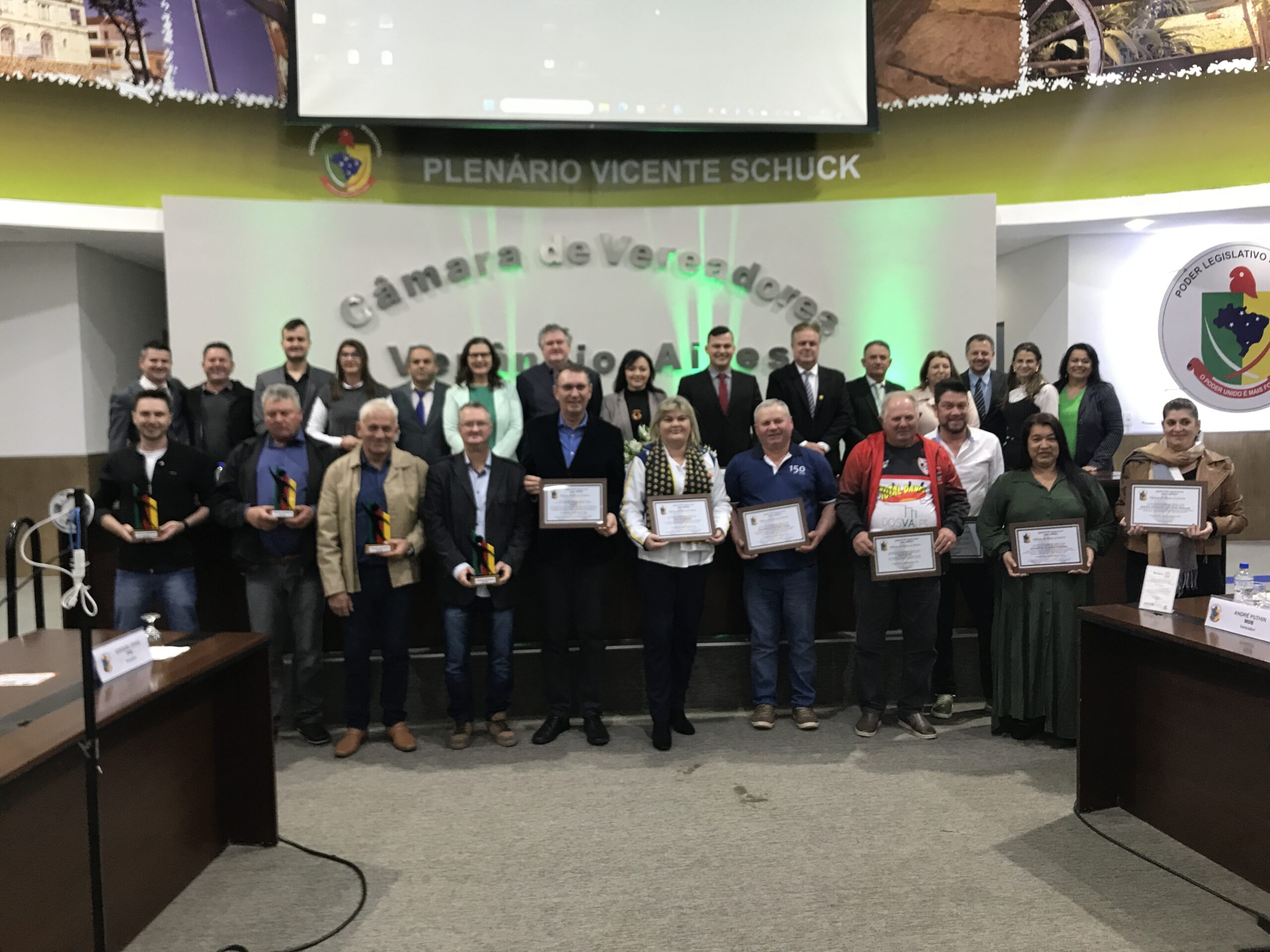 A noite desta quarta-feira, 26, foi especial na Câmara de Vereadores de Venâncio Aires. A sessão solene entregou homenagens para 10 personalidades, entidades e empresas do município, em reconhecimento aos trabalhos realizados no município. Foram entregues o Troféu Câmara Destaque para o Motorista Destaque; Mérito Empresarial; Agricultor Empreendedor; Prêmio Líder Comunitário e Advogado Destaque. Cada homenagem foi proposta por indicação dos vereadores. Outros sete diplomas de mérito foram entregues na reunião solene.
