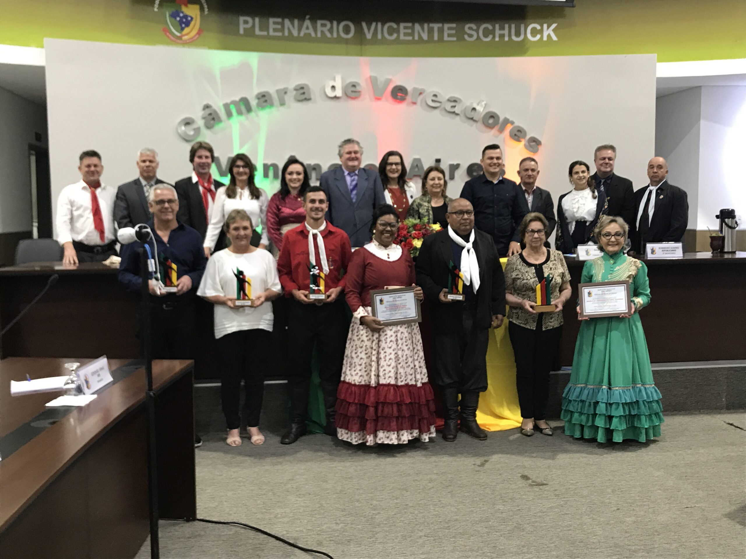 A Câmara de Vereadores realizou na noite desta segunda-feira, 18, sessão solene para marcar a Semana Farroupilha. A programação contou com a entrega de sete homenagens, propostas pelos vereadores. A sessão também teve apresentações artísticas e pronunciamentos.