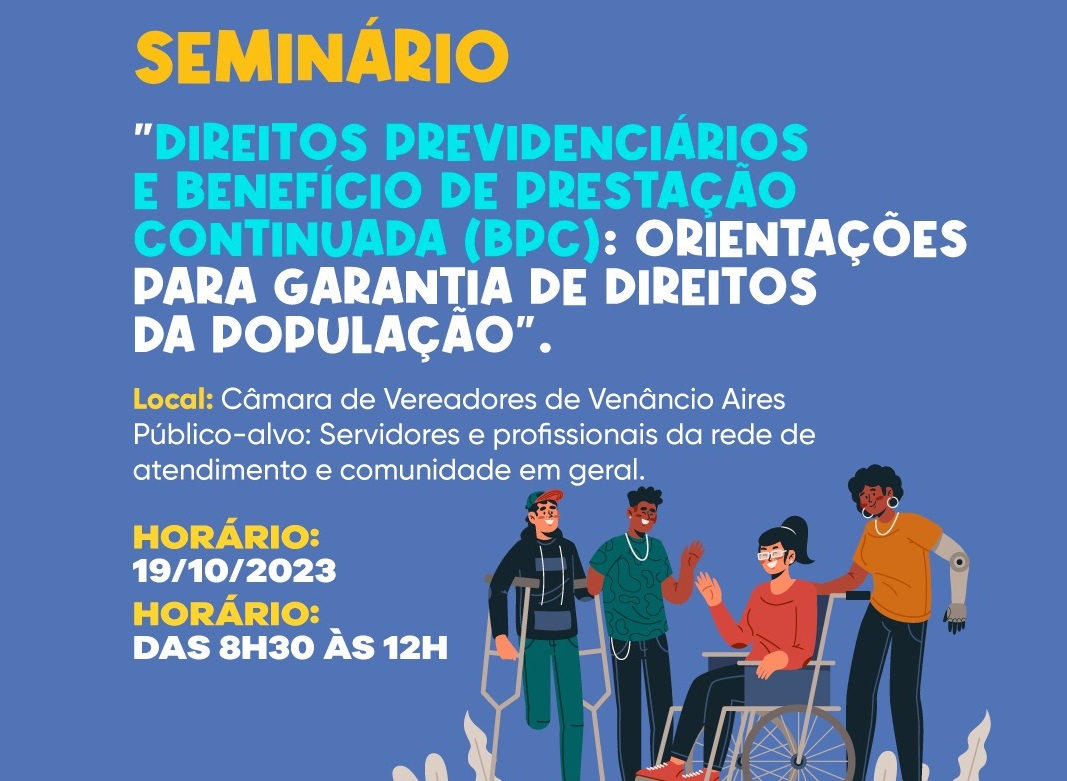 O seminário “Direitos Previdenciários e Benefício de Prestação Continuada (BPC): Orientações para garantia de direitos da população” está com inscrições abertas. O evento é organizado pelo Centro de Referência em Assistência Social (CRAS) do bairro Battisti, em conjunto com o Instituto Nacional do Seguro Social (INSS) e ocorrerá na quinta-feira, 19 de outubro, na Câmara de Vereadores, das 8h30 às 12h. As vagas são ilimitadas e podem ser preenchidas de forma on-line.