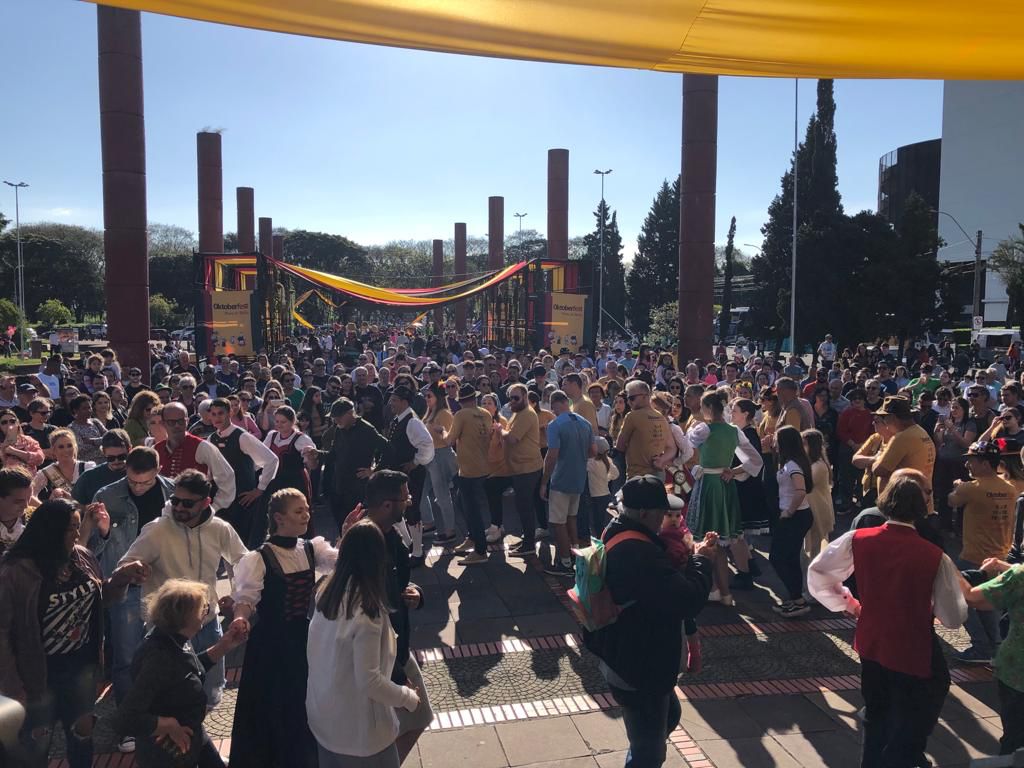 A tradicional polonaise puxada pelo grupo de danças folclóricas Polka Oficial do Centro Cultural 25 de julho protagonizou o ponto alto do Aquece Oktober, na Praça Itália, ao lado do shopping Praia de Belas, neste domingo, em Porto Alegre.