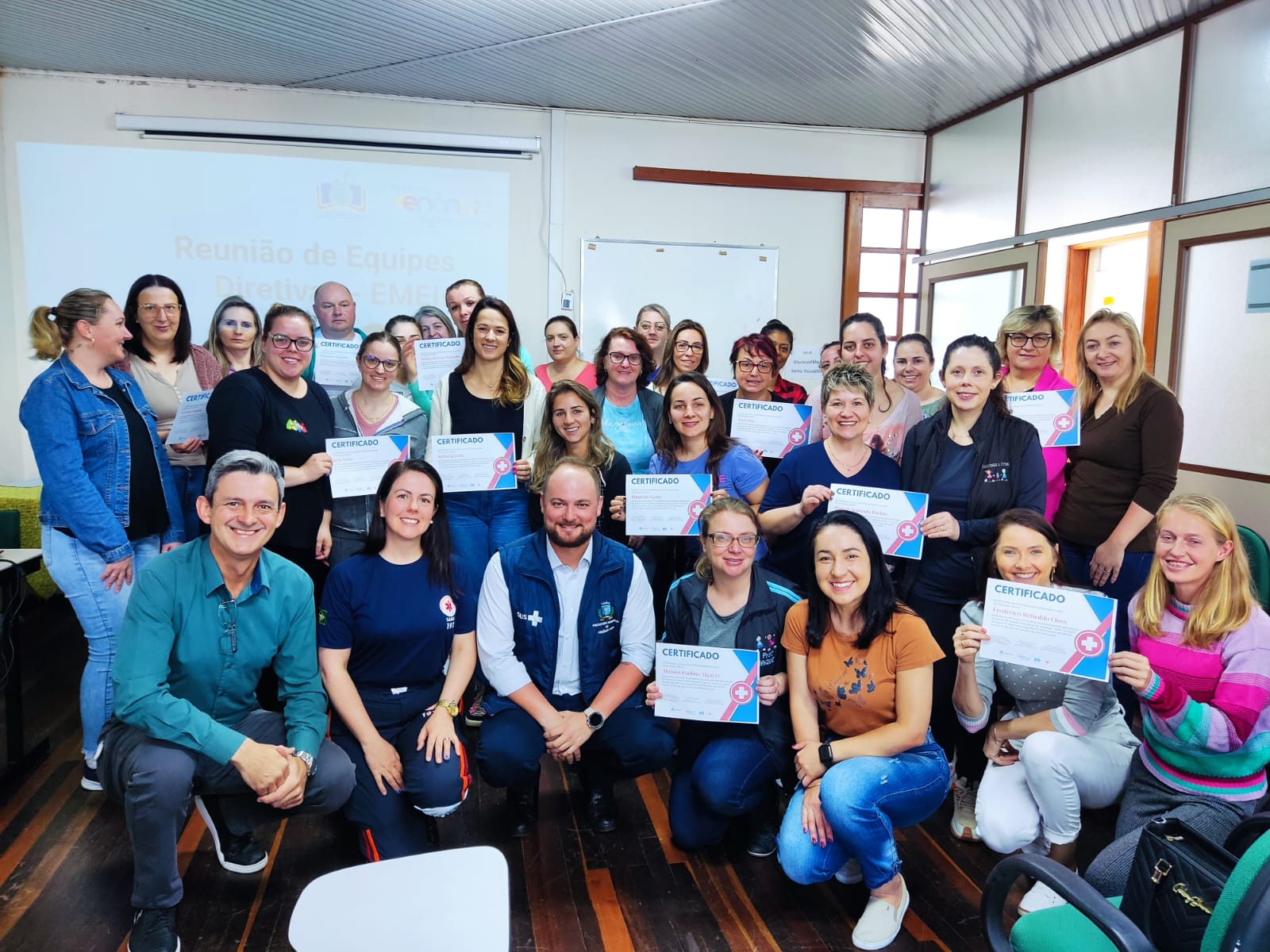 Com 108 horas de capacitação de como proceder em casos como engasgo, convulsão, queda, fratura e desmaio, profissionais da rede municipal de ensino de Venâncio Aires, receberam instruções para garantir e aumentar a segurança de crianças e adolescentes no espaço escolar. Depois dos 27 encontros da programação, promovida pelas secretarias municipais de Educação e de Saúde, em parceria com o Serviço Móvel de Urgência (Samu), as direções das escolas foram reunidas nesta segunda-feira (6) para entrega dos certificados. Na parte da manhã, foram as direções das escolas de Educação Infantil e a tarde para as escolas de Ensino Fundamental, totalizando 845 educadores.