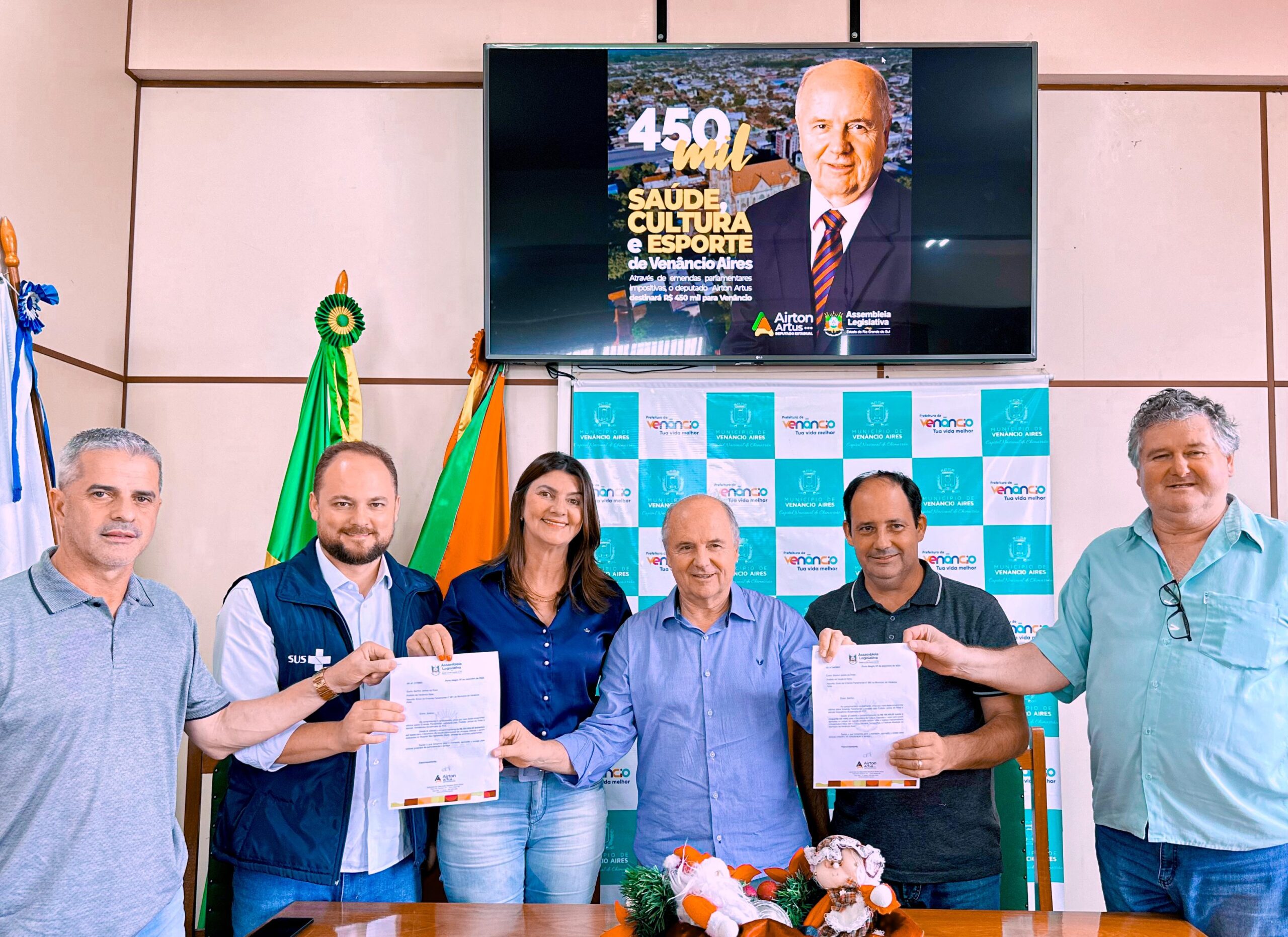 Em reunião realizada na Prefeitura de Venâncio Aires, o deputado estadual Airton Artus (PDT), anunciou emendas parlamentares impositivas no valor de R$ 450 mil às secretarias de saúde, cultura e esportes para o município da Capital do Chimarrão. Além de Venâncio, também houve repasse de R$ 550 mil a Santa Cruz do Sul, Lajeado, Mato Leitão, Passo do Sobrado, Vera Cruz, Cruzeiro do Sul e Arroio do Meio, totalizando R$ 1 milhão.