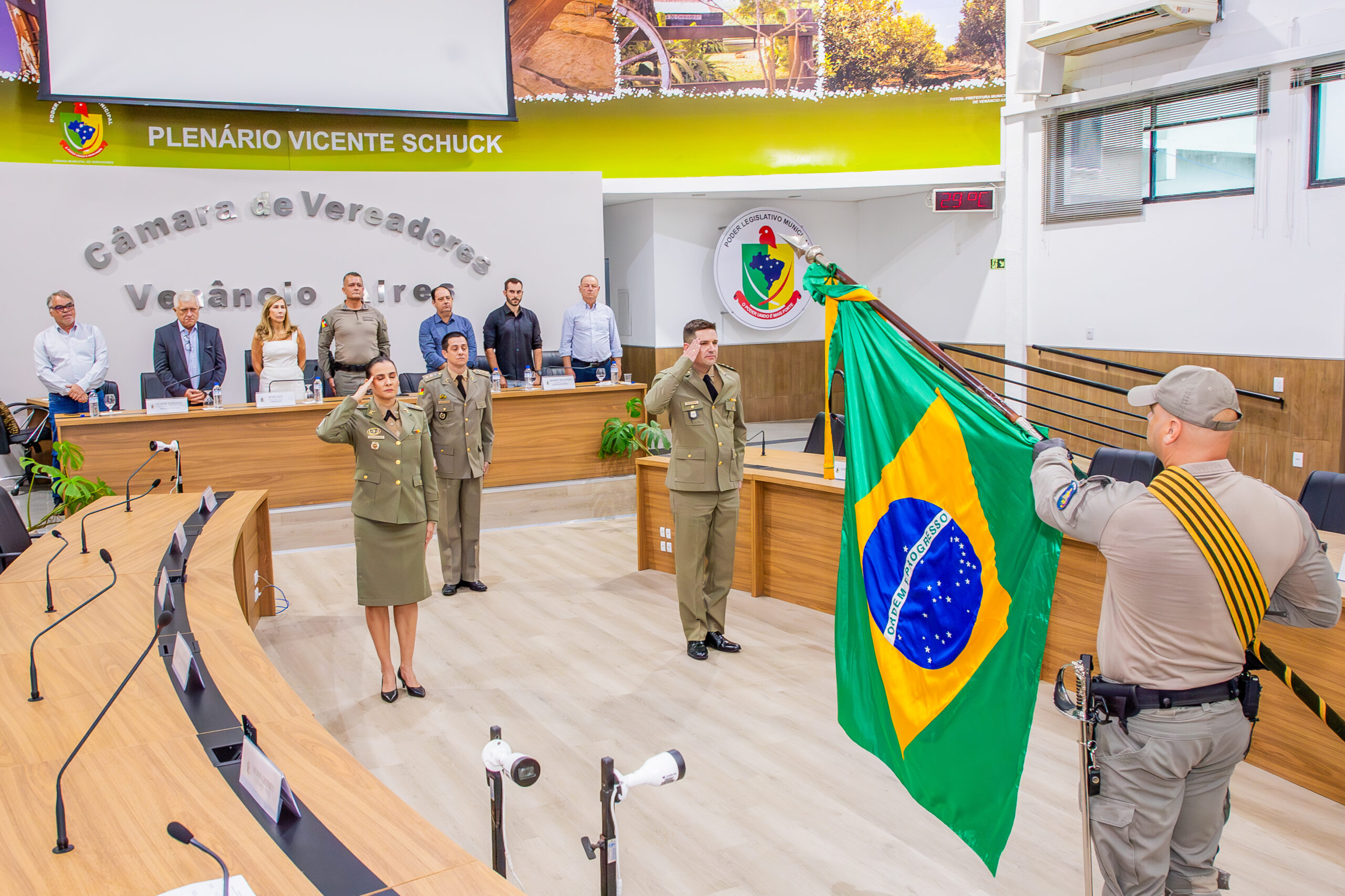 No fim da tarde desta terça-feira, 18, o capitão Maicon Barbosa Crumenauer assumiu o comando da 3ª Companhia Operacional do 23º Batalhão de Polícia Militar (BPM) de Venâncio Aires. A cerimônia de passagem de comando ocorreu no plenário Vicente Schuck, na Câmara de Vereadores, marcando a transição da major Michele da Silva Vargas para o novo comandante.