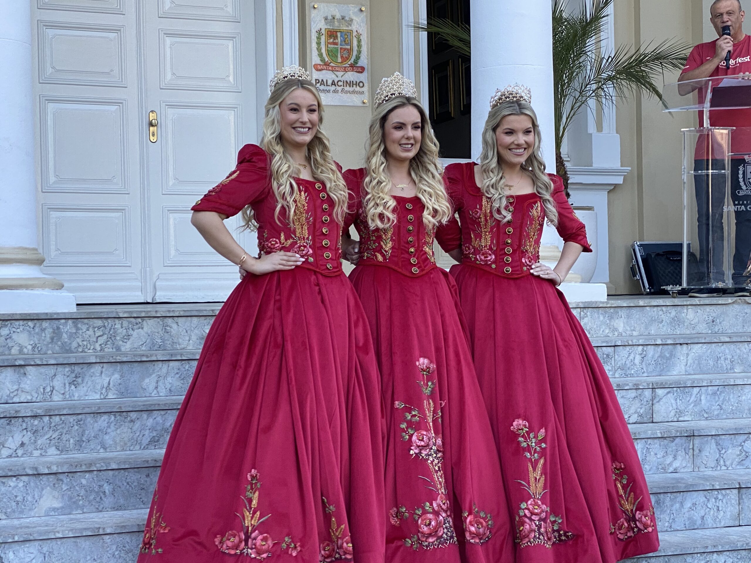 O legado de quatro décadas da Festa da Alegria está presente nos trajes do trio de soberanas da 40ª Oktoberfest de Santa Cruz do Sul, formado pela rainha Rafaela Nicknig e pelas princesas Amanda Regina Werner e Sofia Cristina Pretzel. Os vestidos, oficiais e de passeio, foram apresentados à comunidade em evento realizado na tarde desta sexta-feira, 29, em frente ao Palacinho, na Praça da Bandeira. Os modelos, desenhados e produzidos pelo Atelier Joana Tornquist, traduzem em cada detalhe o espírito do tema desta edição: Reviva as Memórias, Celebre as Tradições. Cores, texturas e acabamentos se unem para narrar a história que conectam passado e presente, em uma homenagem ao patrimônio cultural que molda a identidade de Santa Cruz do Sul.